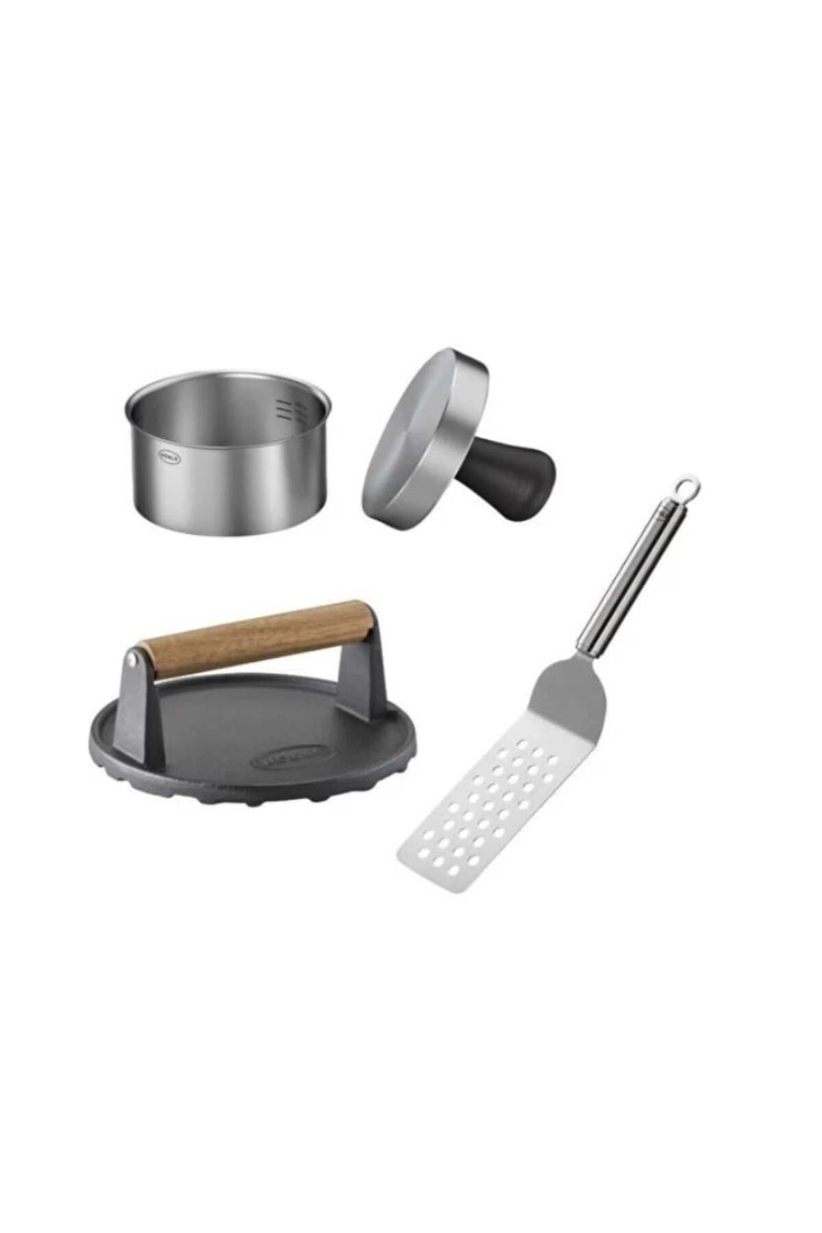 100-300 gr arasında hamburger köftesi için Pro Burger Presi, emaye döküm demirden üretilmiş barbekü ağırlığı, 18/10 paslanmez çelik barbekü spatulası.